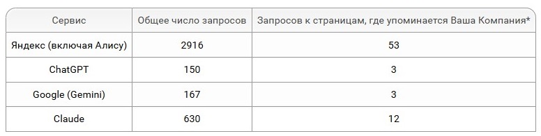 • как часто компания упоминалась в ответах нейросетей;